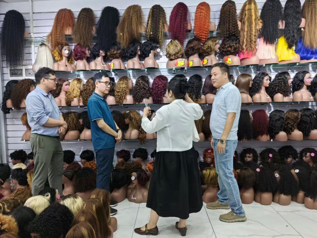在企业创始人王永辉、总经理马品的引导下,刘沛富院长一行首先参观了广州黑美人发制品有限公司的产品展示区、仓储区及运营中心,详细了解企业的发展历程、主营业务布局、海外市场拓展现状及未来发展规划。作为深耕发制品行业的知名企业,该公司在国际市场的品牌运营与跨文化沟通方面的实践经验,为外语人才提供了广阔的实践场景。