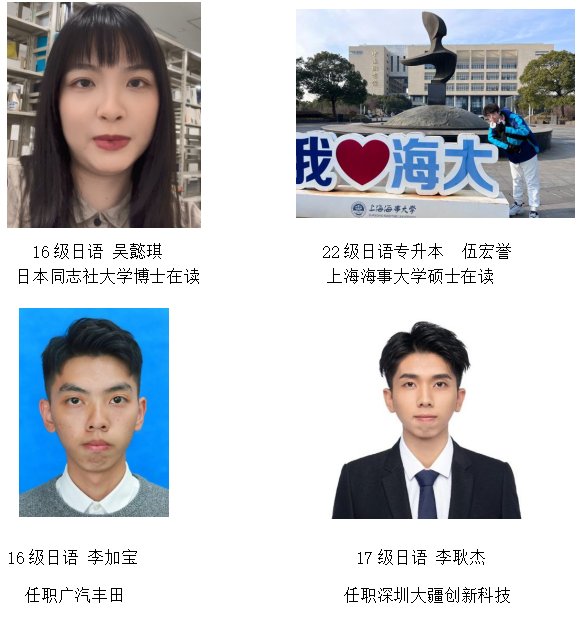 日语学子考研成绩突出。自2020年以来,已有30余名日语学子考取郑州大学、广东外语外贸大学、四川师范大学、日本同志社大学、立命馆大学、英国利兹大学等国内外知名高校研究生。22级日语专升本学生伍宏誉成功考取了上海海事大学日语语言文学硕士研究生。