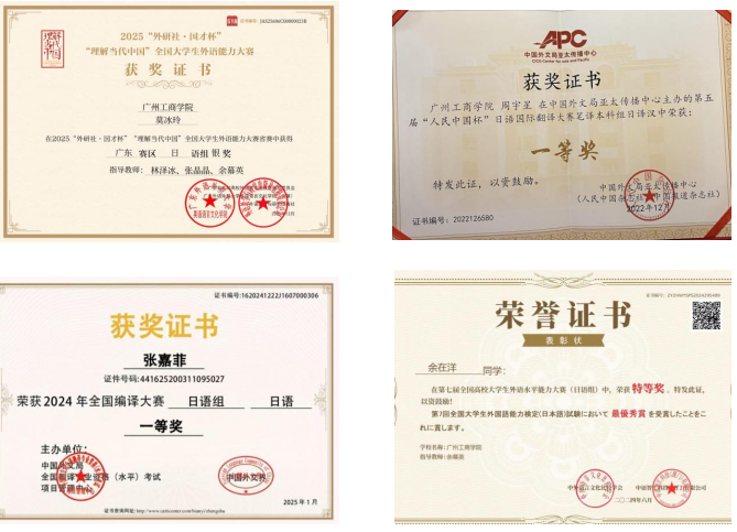 学生多次荣获“人民中国”杯日语国际翻译大赛一等奖,全国编译大赛一等奖,全国高校大学生外语水平能力大赛(日语组)特等奖。