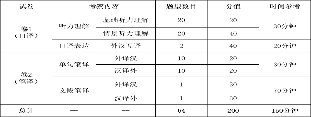 考试满分200分,时间 150 分钟,分口、笔译两张试卷。听力理解、口译表达为一张试卷;单句笔译与文段笔译为一张试卷。(口译或笔译任一单科成绩达到60分及以上可获得相应方向的证书。)