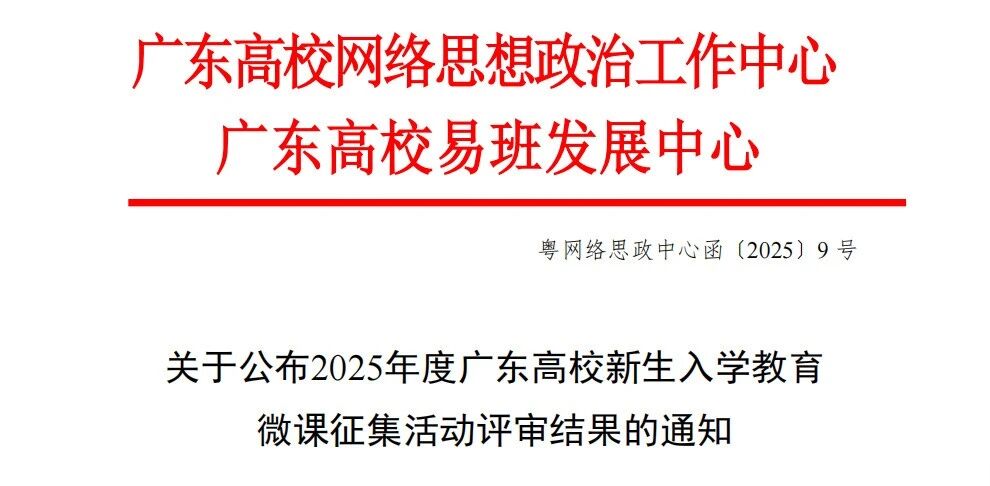 近日,广东高校网络思想政治工作中心、广东高校易班发展中心发布了《关于公布2025年度广东高校新生入学教育微课征集活动评审结果的通知》。活动旨在深入学习贯彻习近平新时代中国特色社会主义思想,推动网络育人工作高质量发展,助力2025级新生更好地适应大学生活、明确发展方向。