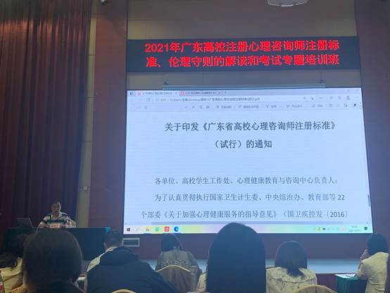 2021年4月15至4月16日,我校学生处心理健康教育与咨询中心李婷婷老师、李淑怡老师赴江门鹤山参加由广东省高校心理健康教育与咨询专业委员会主办的广东高校注册心理咨询师注册标准、伦理守则的解读和考试专题培训班。参加本次培训班的人员包括广东省各高校心理健康教育与咨询中心专兼职老师、学生工作队伍老师与辅导员,共计200余人。