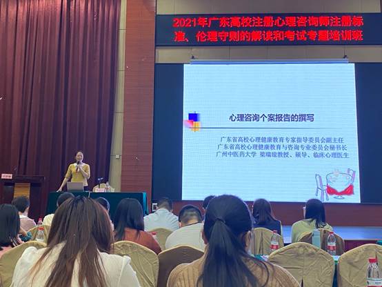 在专题培训中,省高心委主任邱鸿钟教授、广州中医药大学梁瑞琼教授、南方医科大学赵久波教授等知名专家学者们采用理论讲授、案例讨论、经验交流等方式,开展了《广东高校注册心理咨询师注册标准及伦理解读》、《案例报告写作解读》、《精神病性症状的识别和处理》、《案例督导示范及答疑》四场专题培训。通过三位专家深入浅出的理论讲解和生动的案例分析,参训人员对在高校开展心理咨询应遵循怎样的伦理和规则有了更深刻的理解,能初步识别常见的精神病性症状,应对日常心理咨询工作中学生的心理疑难问题。培训后,参训人员纷纷表示收益匪浅,对自身高校心理咨询师这个角色更认同,也更清晰自身应该承担的责任和义务。