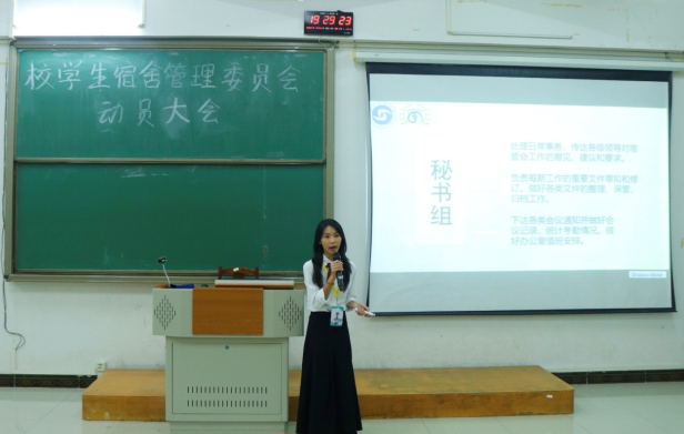 接下来由第十四届副主任欧洁娜上台介绍校学生宿舍管理委员会楼层长和五大组的职能,并由副主任温恒智带领楼层长们就职宣誓,宣誓完毕后由副主任陈彦隆对新干事进行查寝培训,职能介绍和宣誓以及查寝培训使新干事们对宿舍管理制度以及身上肩负的责任有了进一步的了解。