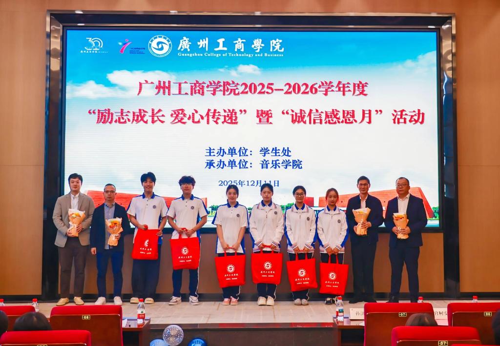 为全面贯彻落实家庭经济困难学生资助政策,不断深化资助育人理念,推进学校“一站式”学生社区综合管理模式建设,着力培养受助学生自立自强、诚实守信、知恩感恩、勇于担当的良好品质,不断增强受奖助学生德学修身意识,创建讲诚信、知感恩、甘奉献的和谐校园。12月11日下午,由广州工商学院学生处主办,音乐学院承办的2025-2026学年“励志成长 爱心传递”暨“诚信感恩月”活动在花都校区图书馆415报告厅举行。学校副校长漆小萍、学生处领导、各二级学院主管学生工作副院长、学工办主任、学生资助管理中心全体老师、音乐学院全体辅导员以及100余名2025级家庭经济困难新生代表出席本次活动。