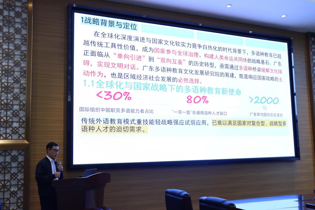 外语学院院长刘沛富汇报了“广东多语种教育文化发展研究院”的建设情况与发展规划。他表示,研究院立足粤港澳大湾区国际化发展需求,致力于通过多语种教育与跨文化传播培养具有国际视野的复合型人才。依托学校坚实的学科与科研基础,研究院聚焦多语种教育、跨文化交际、岭南文化创新、区域国别研究及教育政策与战略研究等重点领域。他强调,研究院将坚持党建引领与学术创新并重,完善科研管理和人才培养机制,推动国际合作与社会服务深度融合,努力建设成为服务国家战略和区域发展的高水平学术与智库平台。