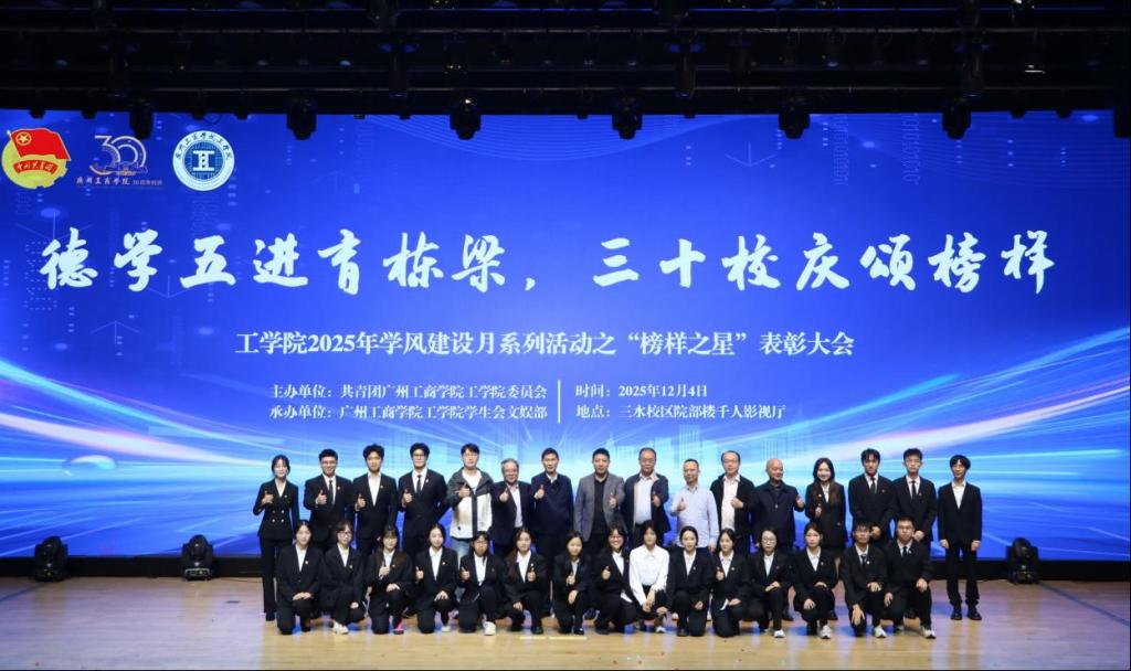 【本网讯】为深化“德学·五进”特色校园文化,弘扬榜样精神,庆祝学校30周年华诞,12月4日下午,广州工商学院工学院在三水校区举行“德学五进育栋梁,三十校庆颂榜样”2025年学风建设月系列活动之“榜样之星”表彰大会。学校副校长漆小萍,校长助理易亚军,学生处副处长苏建贤,工学院院长张永平,工学院党委书记、执行院长宋锋华,工学院副院长罗俊、欧仕益,工学院优秀校友代表、师生代表共聚一堂,见证荣誉时刻,汲取奋进力量。