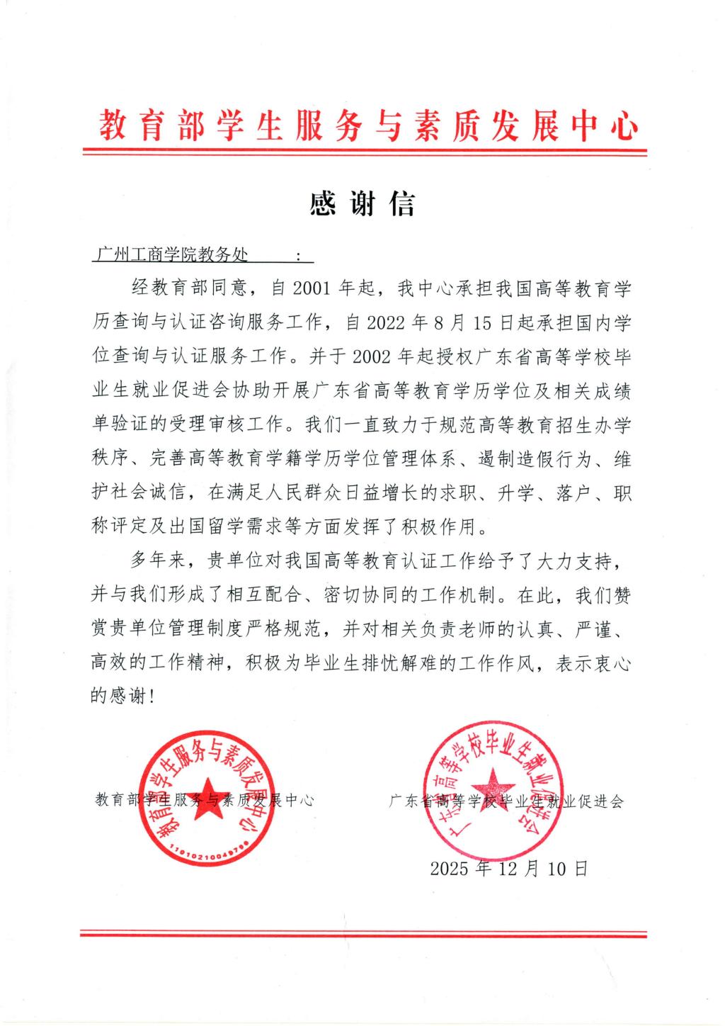【本网讯】近日,教育部学生服务与素质发展中心、广东省高等学校毕业生就业促进会联合向我校发来感谢信,对我校在高等教育学历学位认证等工作中给予的支持表示衷心感谢。