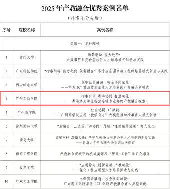 【本网讯】近日,工业和信息化部人才交流中心公布了2025年产教融合优秀案例名单,广州工商学院和前海粤十的合作成果《标准引领•粤港协同•智慧赋能——粤港澳大湾区智慧冷链专业群的产教融合探索》案例成功入选。此次评选面向全国,经自主申报、形式审查、专家评审等多轮遴选,共产生优秀案例100个。我校案例排名第4(全国百家院校,24所本科高校上榜)。