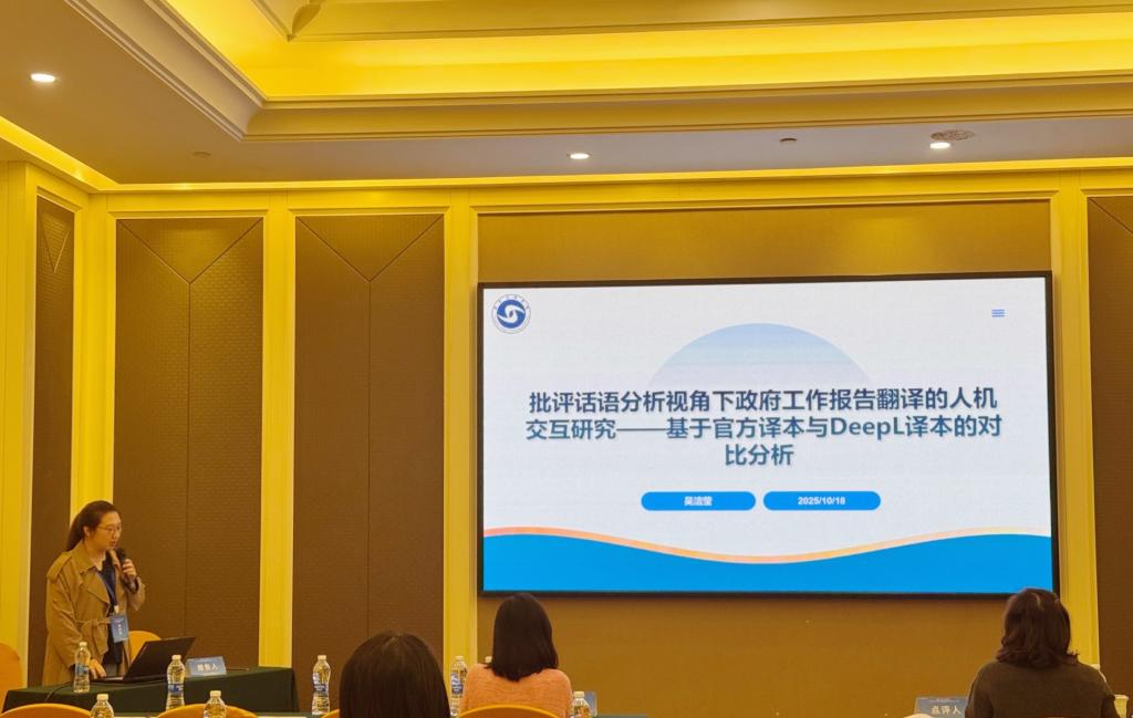 吴洁莹老师在分论坛3“人机协同与翻译实践”中作了题为《批评话语分析视角下政府工作报告翻译的人机交互研究——基于官方译本与DeepL译本的对比分析》的报告。研究运用Fairclough的三维分析模型,从文本实践、话语实践和社会实践三个层面对2025年广东省政府工作报告的官方英译本与DeepL机器译本进行对比分析。