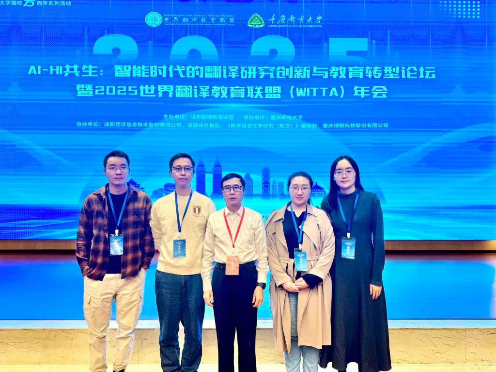 【本网讯】10月17日至19日,AI-HI共生:智能时代的翻译研究创新与教育转型论坛暨2025世界翻译教育联盟(WITTA)年会在重庆召开,会议由世界翻译教育联盟(WITTA)主办、重庆邮电大学承办。我校外语学院教师代表受邀参会,院长刘沛富教授带队,樊志强、吴洁莹、贺丹、夏逸慧四位教师出席会议并做学术报告。