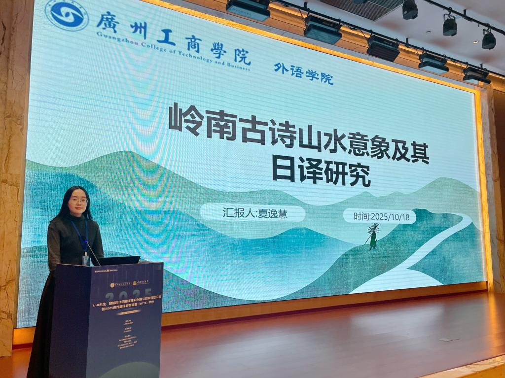 夏逸慧老师在分论坛6“AI赋能的翻译研究”中作了题为《岭南古诗山水意象及其日译研究》的报告。研究以日本文献中保存的岭南题材古诗及其日语译本为对象,聚焦岭南山水意象的文化内涵与跨文化转译策略,展示人工智能背景下传统文化研究与外语翻译研究的创新结合。