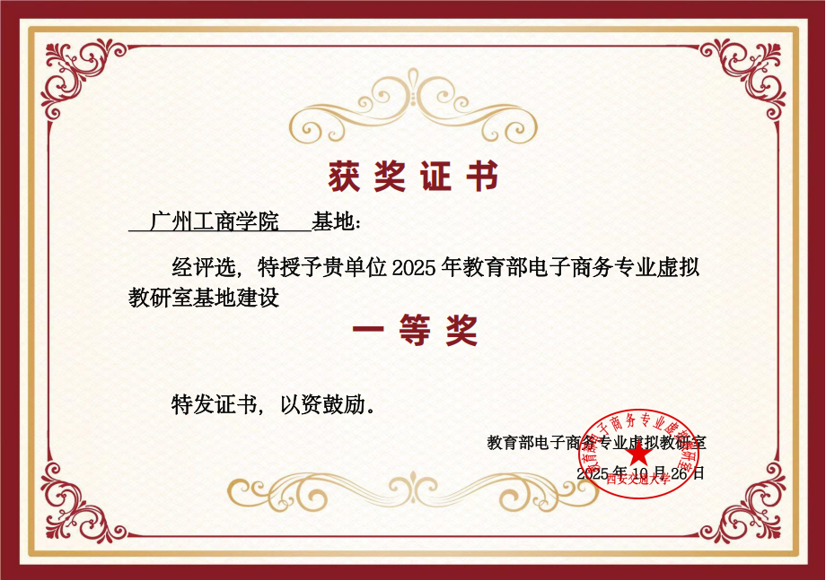 【本网讯】近日,教育部电子商务虚拟教研室公布了2025年度全国电子商务虚拟教研室教学基地建设评选结果。经专家组评审与公示,广州工商学院电子商务专业实践教学基地凭借先进的育人理念、扎实的教学改革成果和突出的产教融合特色,从全国众多申报单位中脱颖而出,荣获“教育部电子商务虚拟教研室教学基地一等奖”,成为广东省唯一获此殊荣的本科院校。