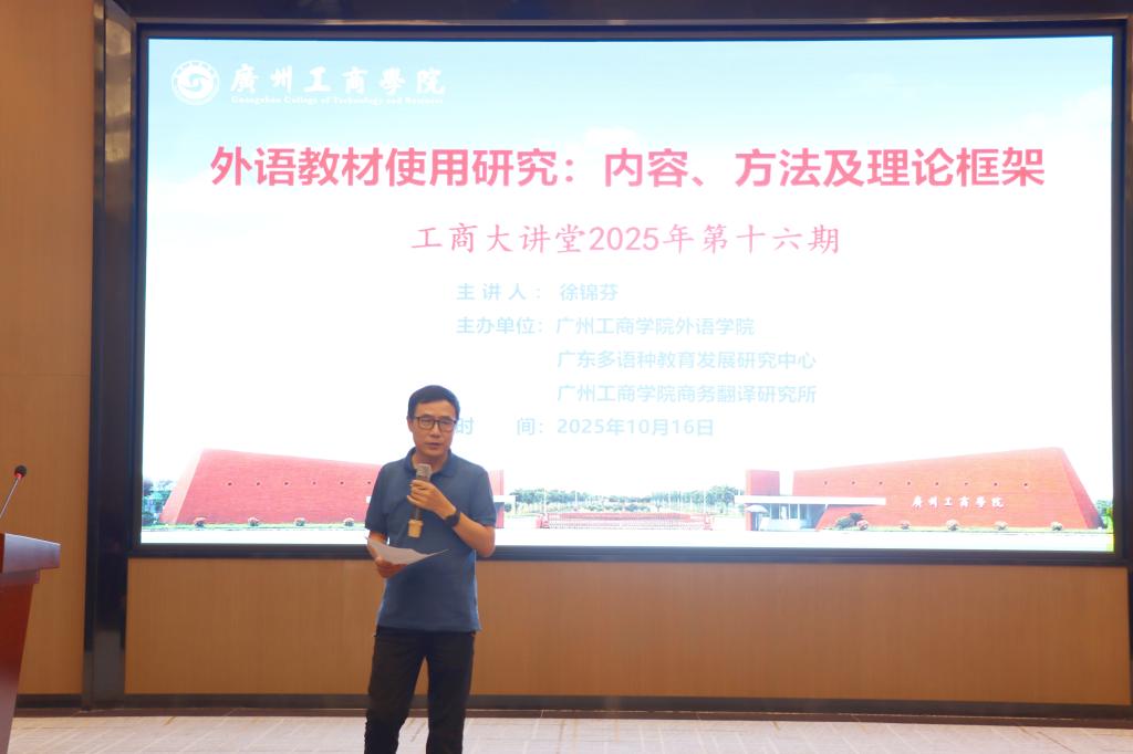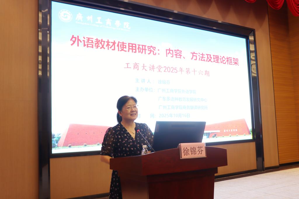 【本网讯】10月16日,“工商大讲堂”2025年第十六期学术讲座在广州工商学院花都校区成功举办。本次讲座由外语学院、广东多语种教育发展研究中心、广州工商学院商务翻译研究所联合主办,特邀华中科技大学二级教授、博士生导师徐锦芬担任主讲嘉宾,围绕《外语教材使用研究:内容、方法及理论框架》展开深入讲解。讲座由外语学院党委书记、院长刘沛富教授主持,外语学院百余名教师到场聆听。