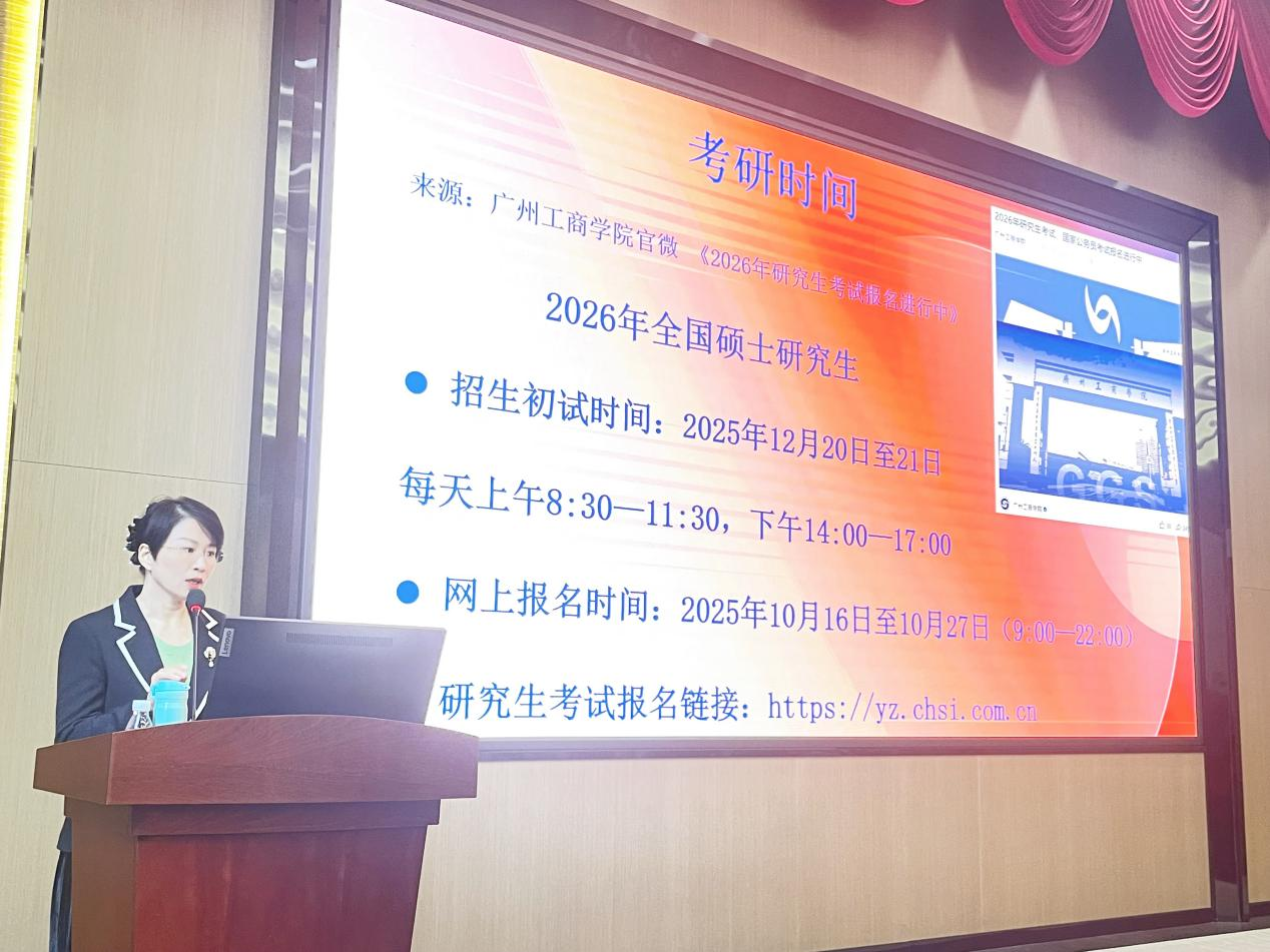 【本网讯】为助力艺术类本科生拓宽升学视野、明晰职业发展路径,10月22日下午,广州工商学院在花都校区举办艺术类本科生多元升学途径与职业规划讲座。本次讲座由教务处组织,特邀广州大学美术与设计学院副教授、硕士研究生导师张扬博士担任主讲嘉宾,吸引了美术学院、国际教育学院二分院共计125名学生代表及相关教师、教学管理人员积极参与。