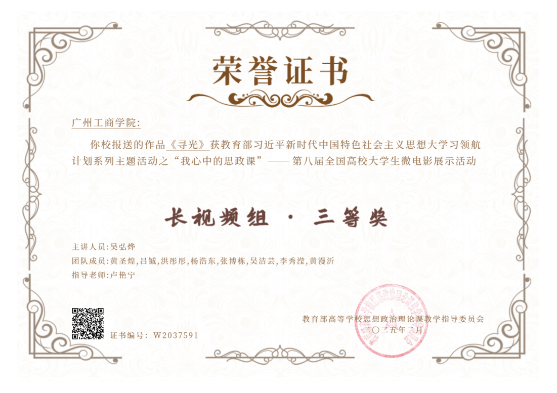【本网讯】近日,教育部公布“我心中的思政课”——第八届全国高校大学生微电影展示活动评审结果,工学院学生团队(吴弘烨、黄圣煌、吕铖、杨浩东、张博栋、洪彤彤、李秀滢、吴洁芸、黄漫沂)在我校马克思主义学院卢艳宁老师指导下创作的微电影作品《寻光》历经自主申报、学校推荐、网上初评、专家评委复评等多个阶段,在全国1006所高校提交的3134部微电影作品中脱颖而出,荣获全国三等奖,实现了我校在该项赛事中的零的突破。