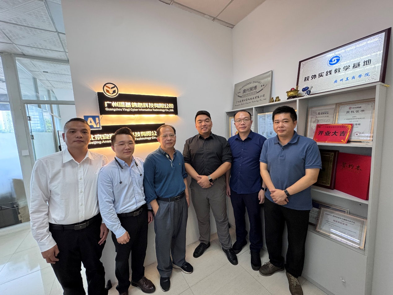 参与走访的成员由学校校友会副秘书长钟院生、校友会办公室主任余伟波、工学院校友分会副会长罗俊、工学院教师钟百胜以及广州校友分会秘书长肖志豪校友共同组成。交流中,广州盈基信息科技公司负责人黄章国校友首先详细介绍了企业的发展历程、核心业务、技术优势及未来规划。同时,他结合自身成长经历与企业发展成果,提出拟在工学院设立 “盈基网科校友奖学金” (暂名)的想法,计划用于奖励网络安全领域实践能力突出的学生,以此回馈母校培养,鼓励学弟学妹深耕专业领域,为行业发展储备人才。