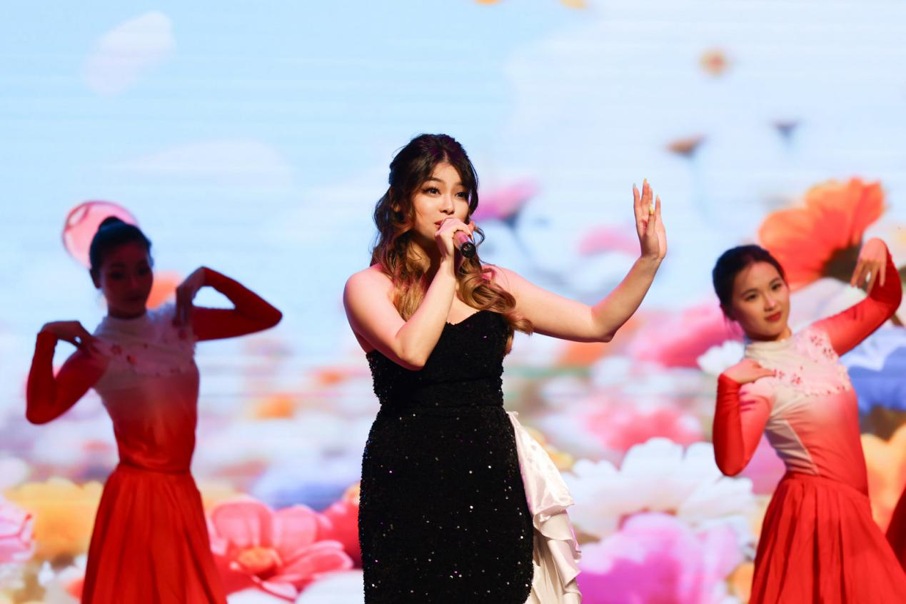 杨莉莎老师以一首旋律温暖动人的《一路生花》(乡村振兴版),展现乡村振兴的美好图景。舞蹈编导专业李楠、程东起、宋思妤、李慧敏、舒心、石凯燕、梁思琪、方景萱8位同学在邓婷老师的精心编排下为歌曲伴舞,舞姿灵动优美,与歌声完美融合。帅斌老师深情演唱《中国红心》,歌声铿锵有力、饱含家国情怀,点燃全场热烈氛围。