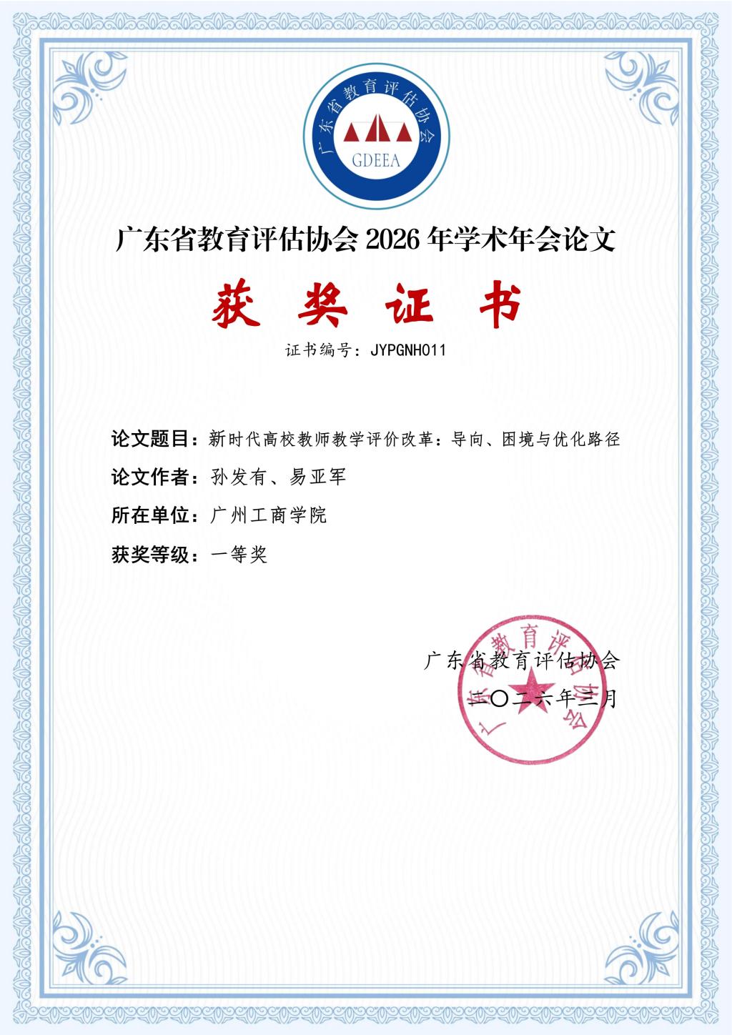 大会同期公布了2026年学术年会优秀论文评选结果。孙发有、易亚军提交的《新时代教师教学评价改革:导向、困境与优化路径》荣获本次学术年会优秀论文一等奖。